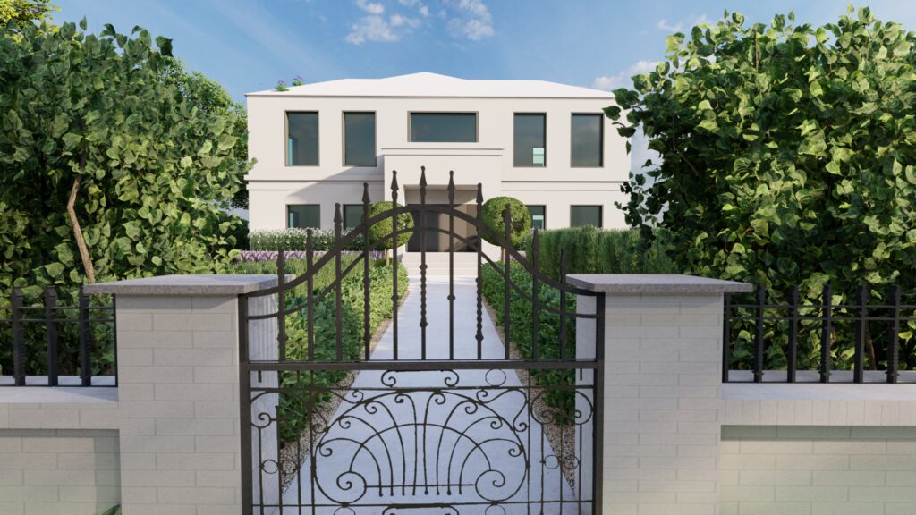 This garden is organised into front yard, courtyard, and backyard zones, balancing formality with relaxed living. The front yard presents a symmetrical entry with wrought-iron gates, stone columns, clipped hedges, and a geometric water feature, creating a refined sense of arrival and privacy. The central courtyard features sculptural landscape stones paired with drought-tolerant planting, forming a calm, low-maintenance visual pause. The backyard becomes a multifunctional retreat with timber decking, dining and social areas, a pool, water feature, and tropical planting. Together, the design offers a layered, elegant, and low-maintenance garden for modern homes.