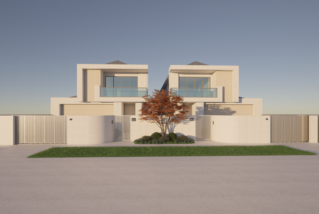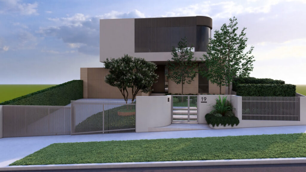 Designed for a long and narrow site, this modern garden focuses on clarity, comfort, and low maintenance. Vertical metal fencing and natural stone walls frame the front yard, where a beautiful tree anchors the space alongside structured lawn, clipped shrubs, and drought-tolerant planting. A softly layered side garden offers privacy and a calm transition. The backyard becomes the social heart, featuring a swimming pool, sun lounges, a fire pit seating area, and an alfresco zone with swing seating. Light-toned materials and resilient planting bring cohesion to a practical yet inviting family garden.