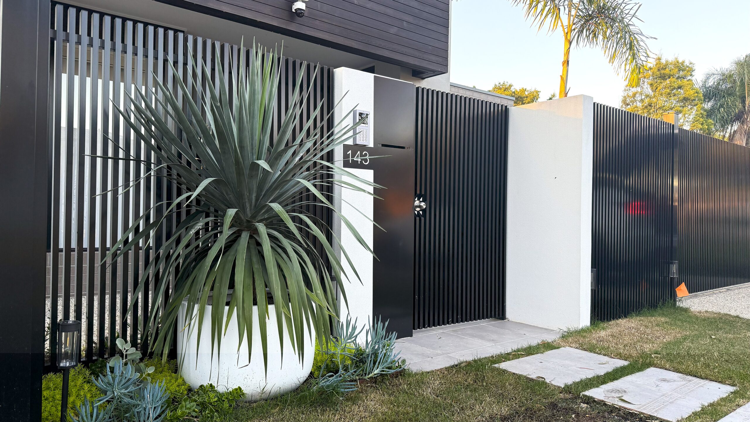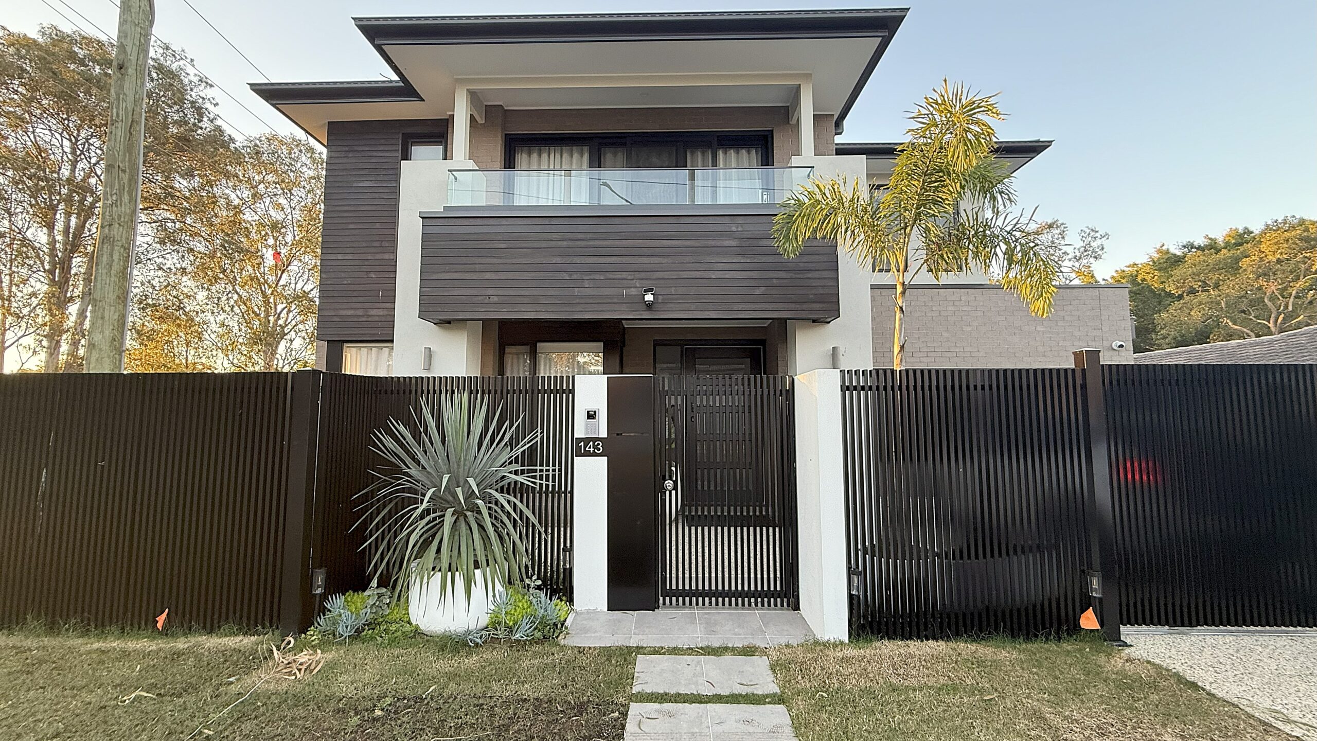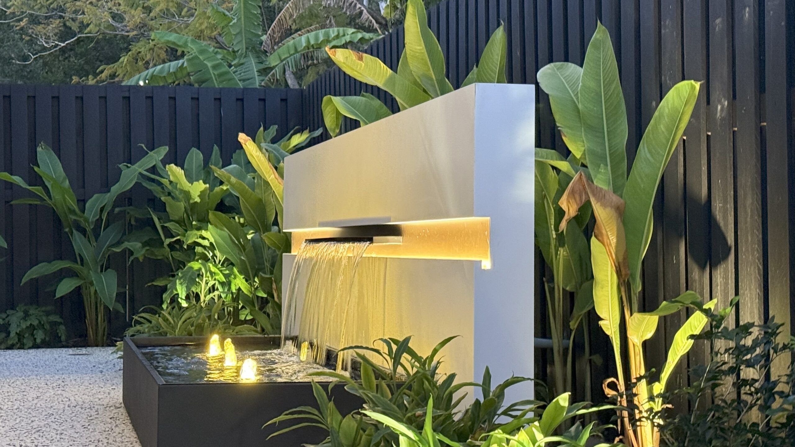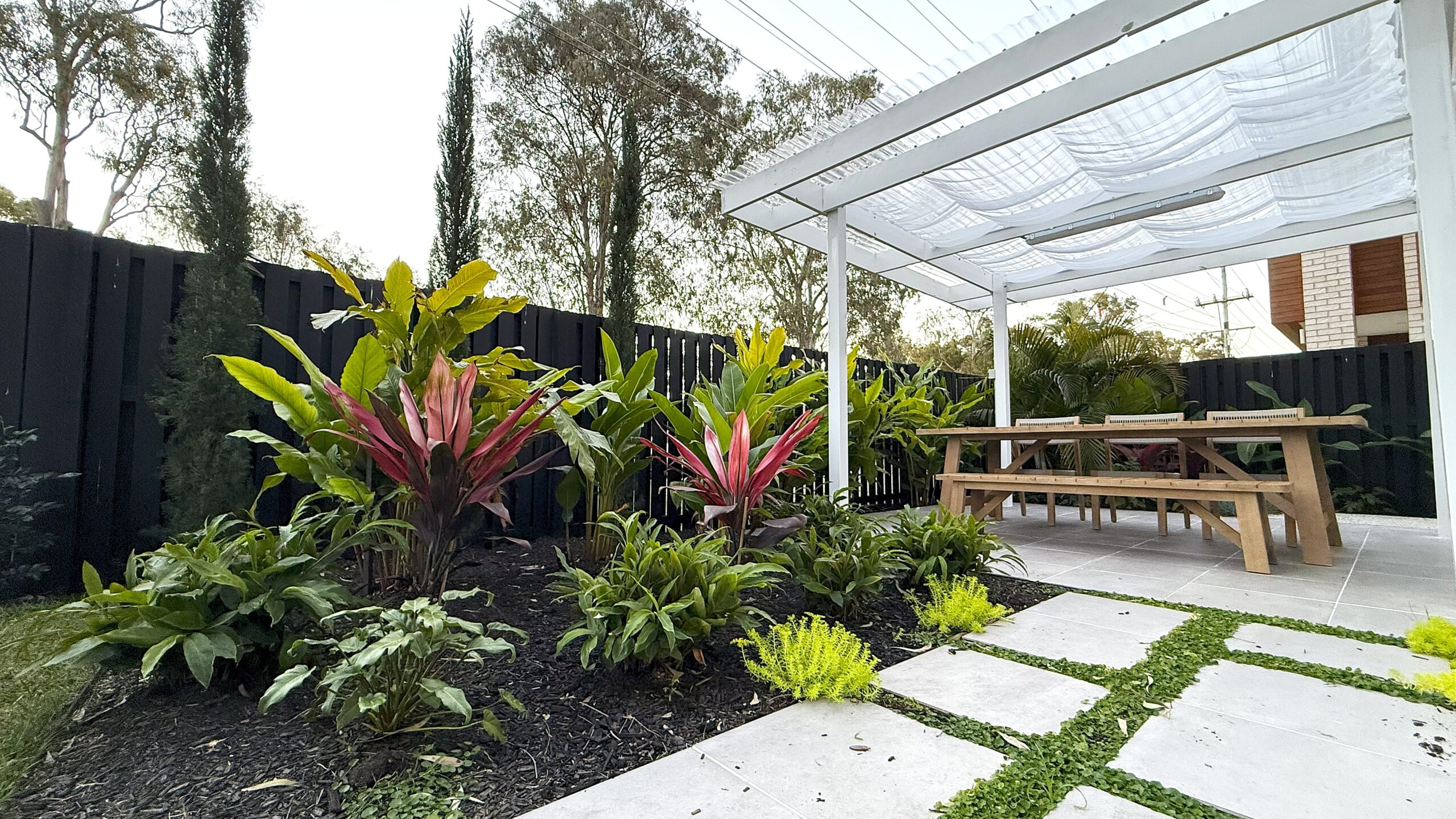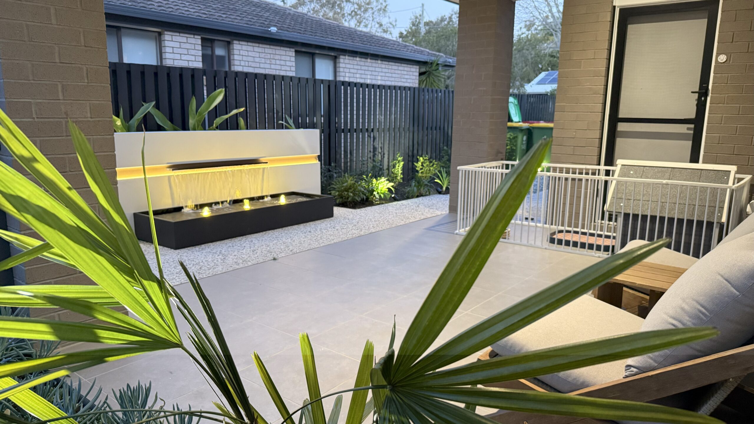 This tropical vacation style Brisbane home.custom designed modern front fence create the inviting and welcoming vibe. In front of the alfresco, we have designed a cascading water feature with bubbling fountain as focal provide for indoor and outdoor. The pergola with transparent roofing at the backyard is ideal for all year round gatherings and relaxing. White curtains sway gently, adding elegance, while fresh air and greenery create a perfect retreat.