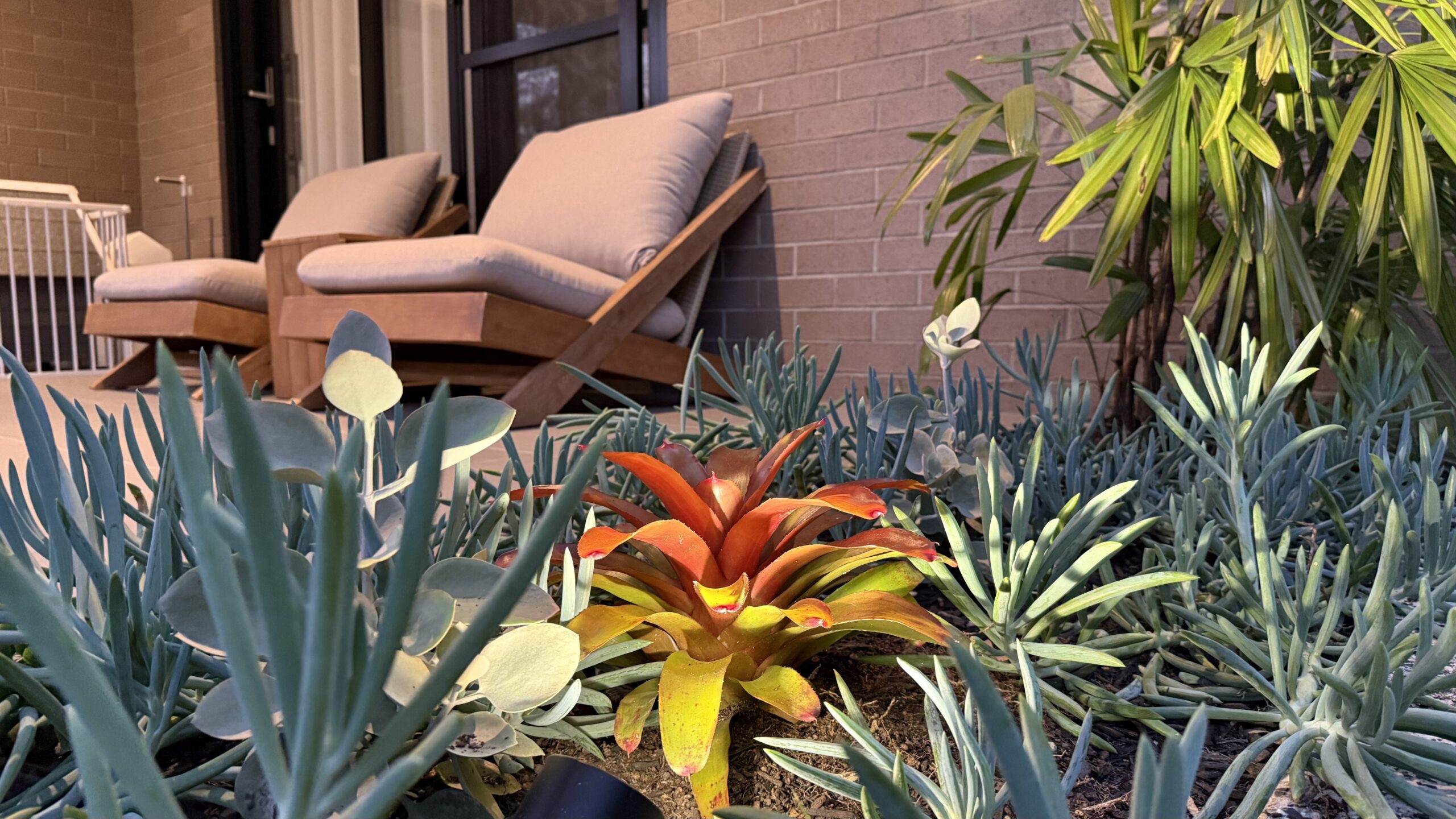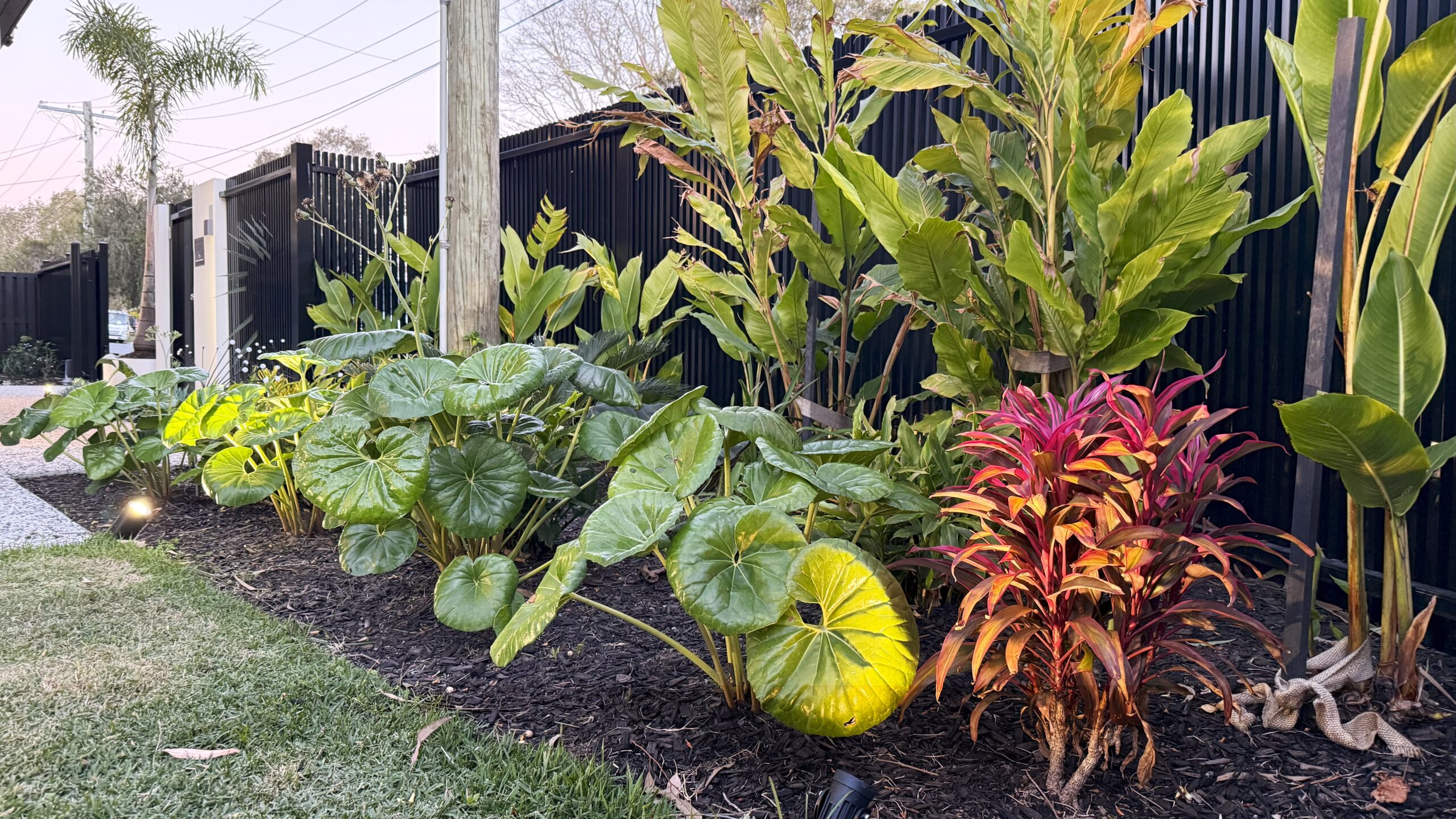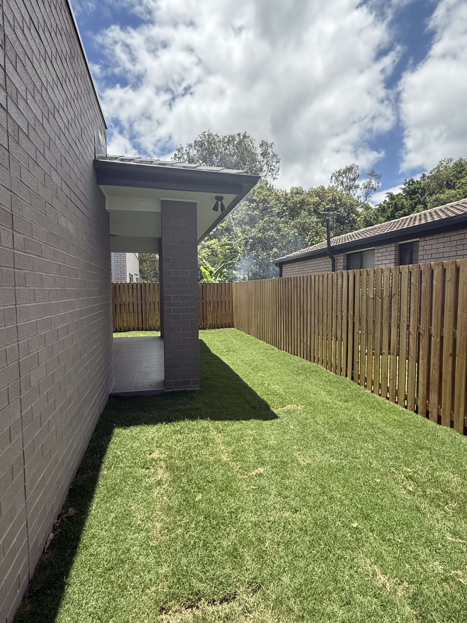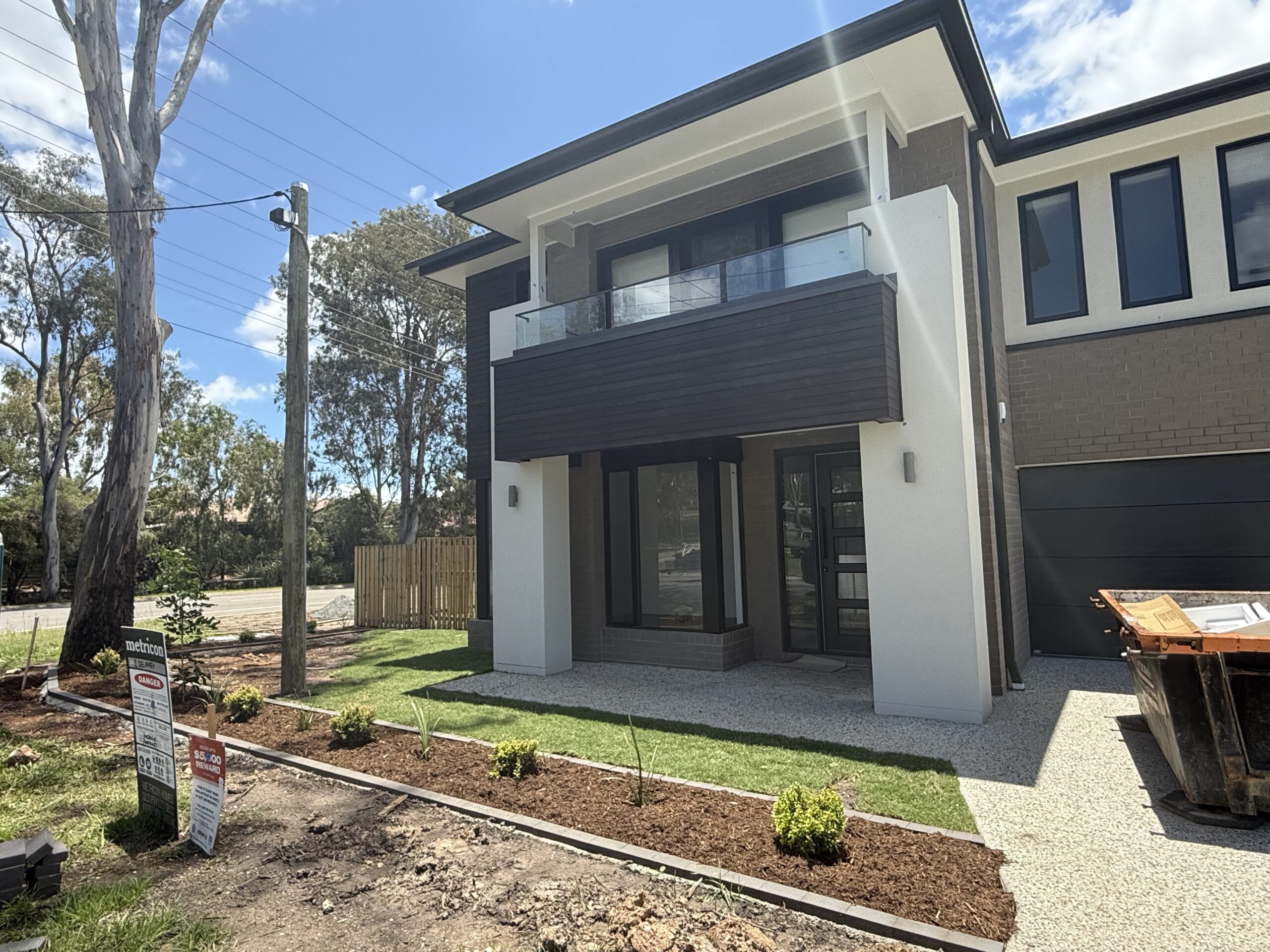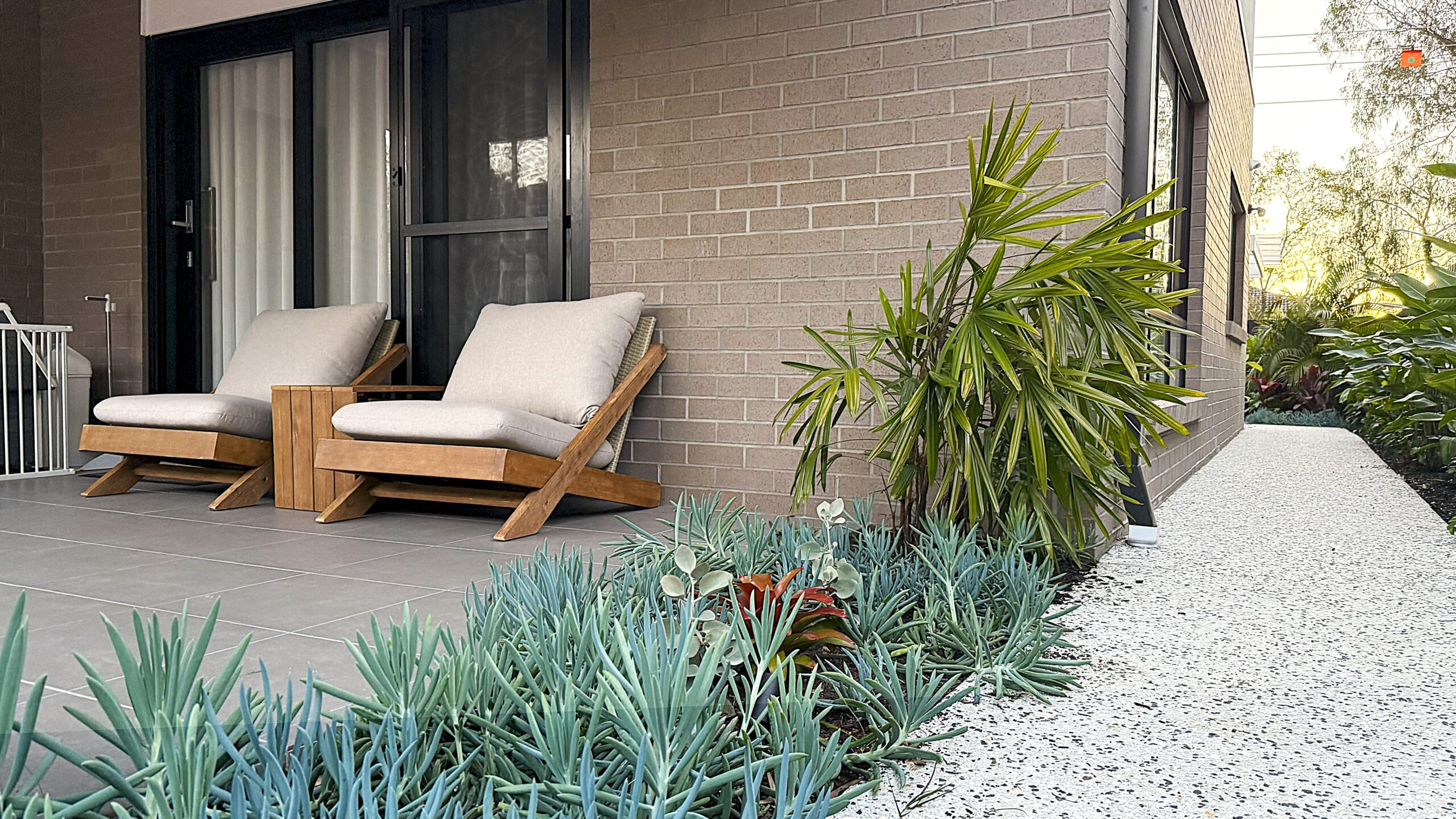 This tropical vacation style Brisbane home.custom designed modern front fence create the inviting and welcoming vibe. In front of the alfresco, we have designed a cascading water feature with bubbling fountain as focal provide for indoor and outdoor. The pergola with transparent roofing at the backyard is ideal for all year round gatherings and relaxing. White curtains sway gently, adding elegance, while fresh air and greenery create a perfect retreat.