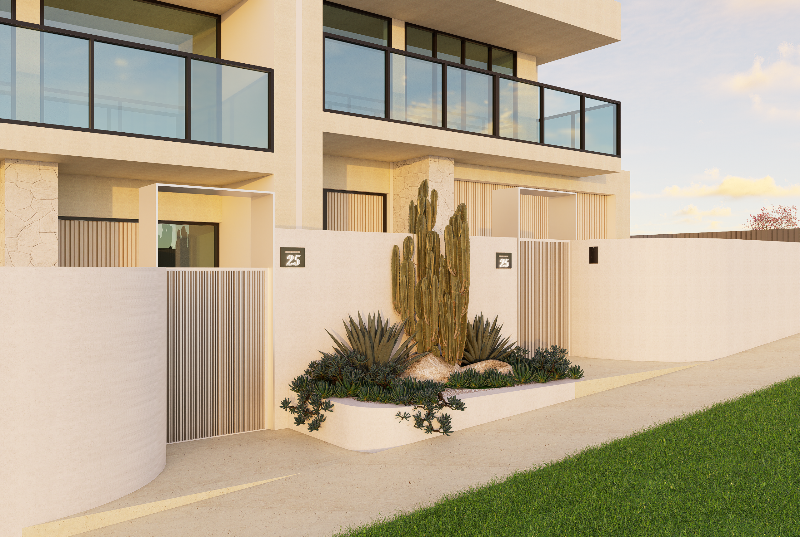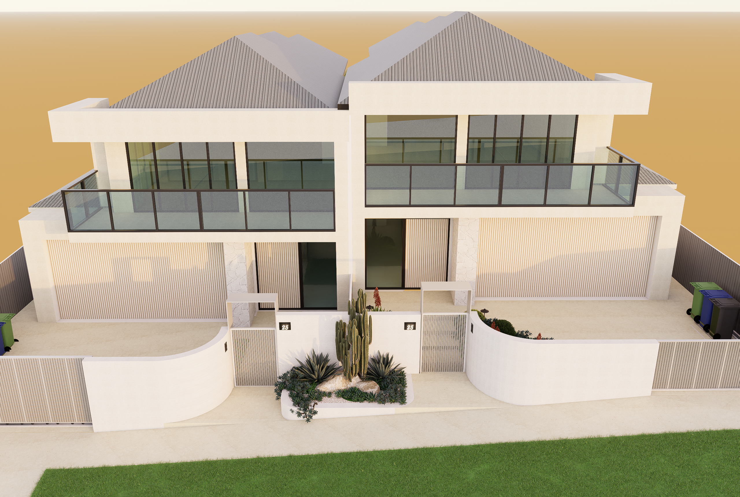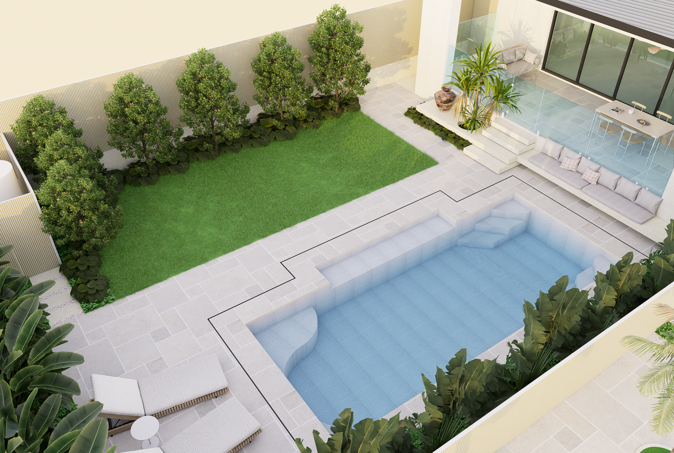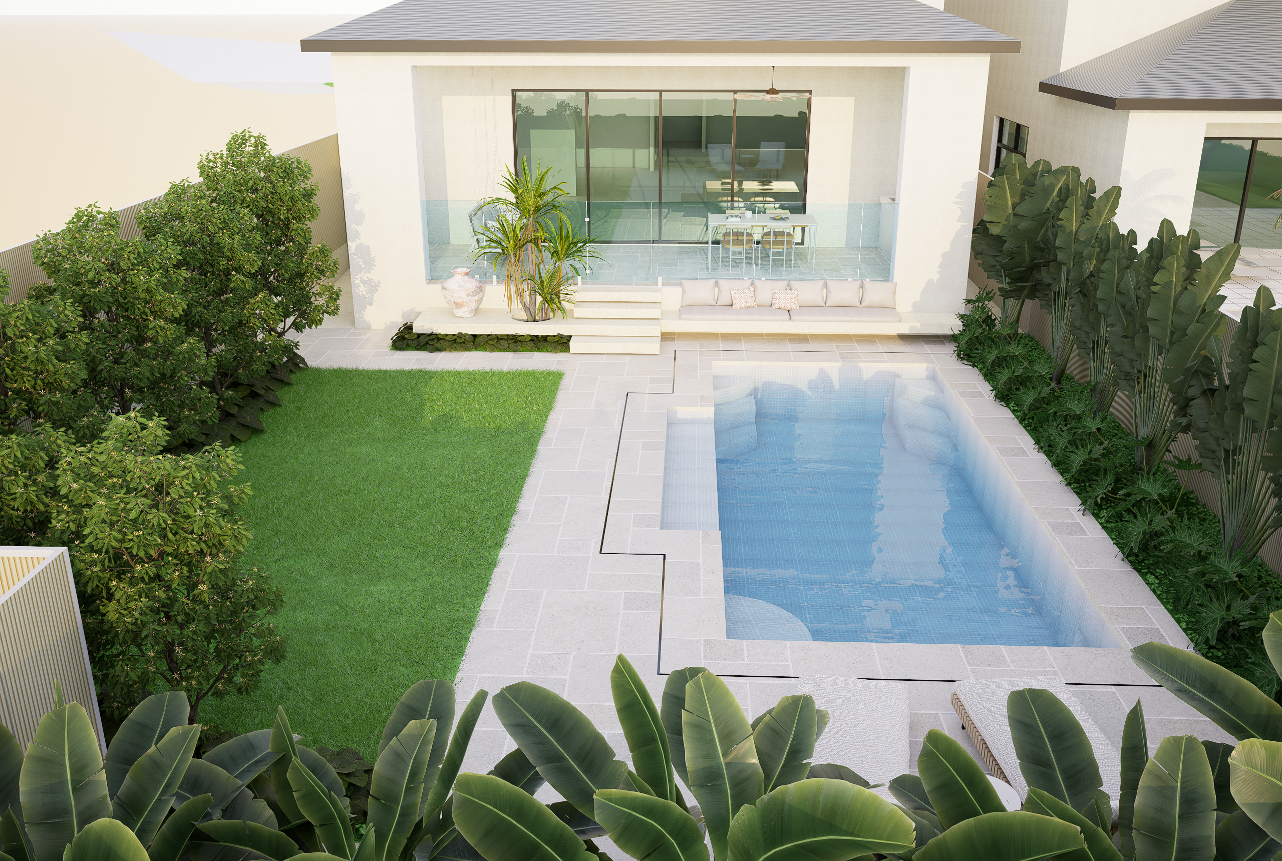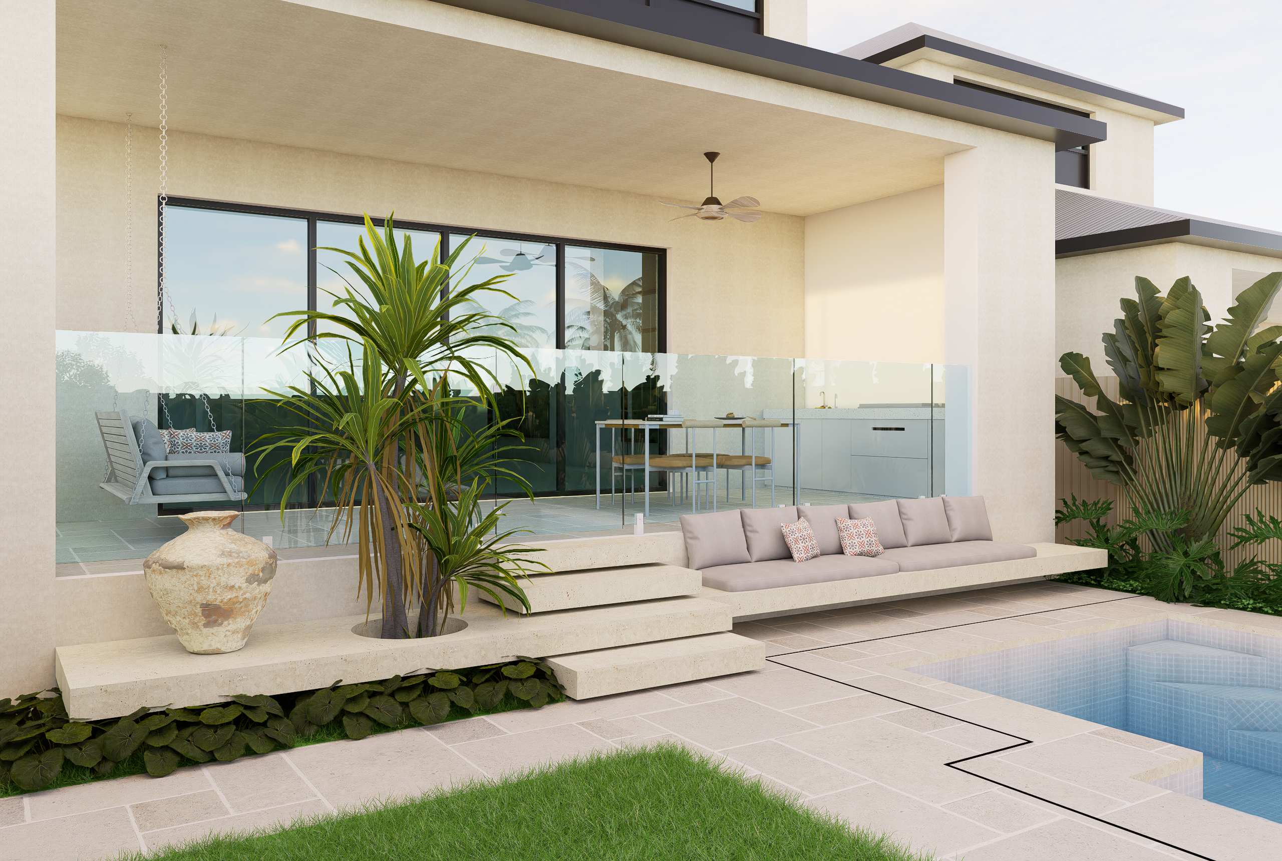 Set across a sloping site, this duplex garden blends modern tropical character with practical planning. The front public zone features a bold xeriscape palette of cacti and agave, framed by vertical metal fencing and off-white stone walls to define entry and privacy. Along the internal path, clipped shrubs and flowering groundcovers add depth and seasonal interest. The rear garden offers a relaxed retreat, with a swimming pool, lawn, sun lounges, and lush tropical planting. An alfresco dining area with swing seating and glass balustrades completes this low-maintenance garden designed for everyday living and entertaining.