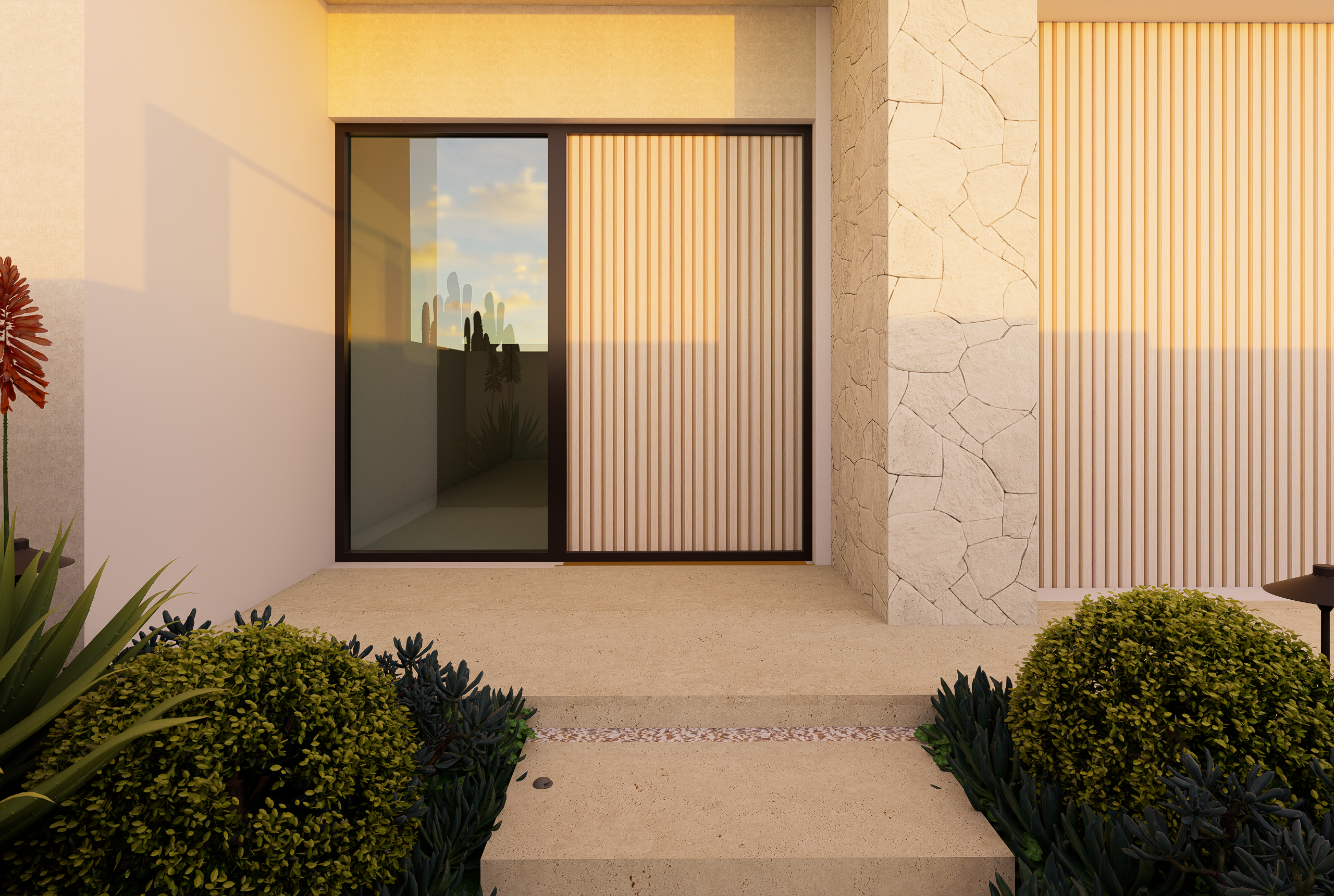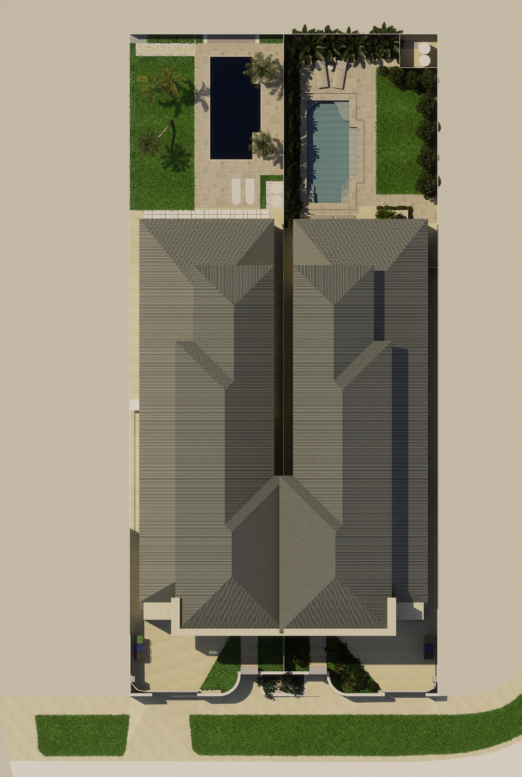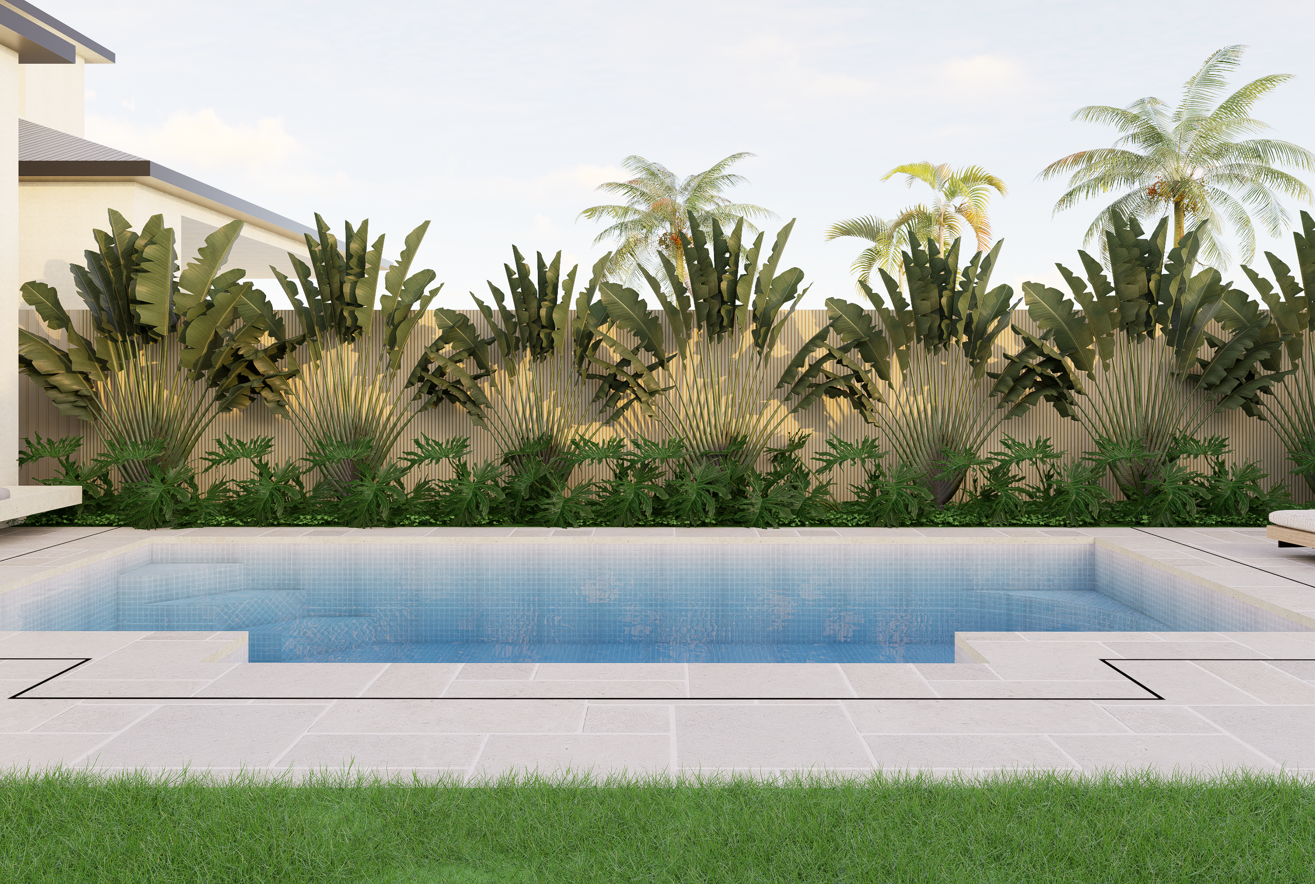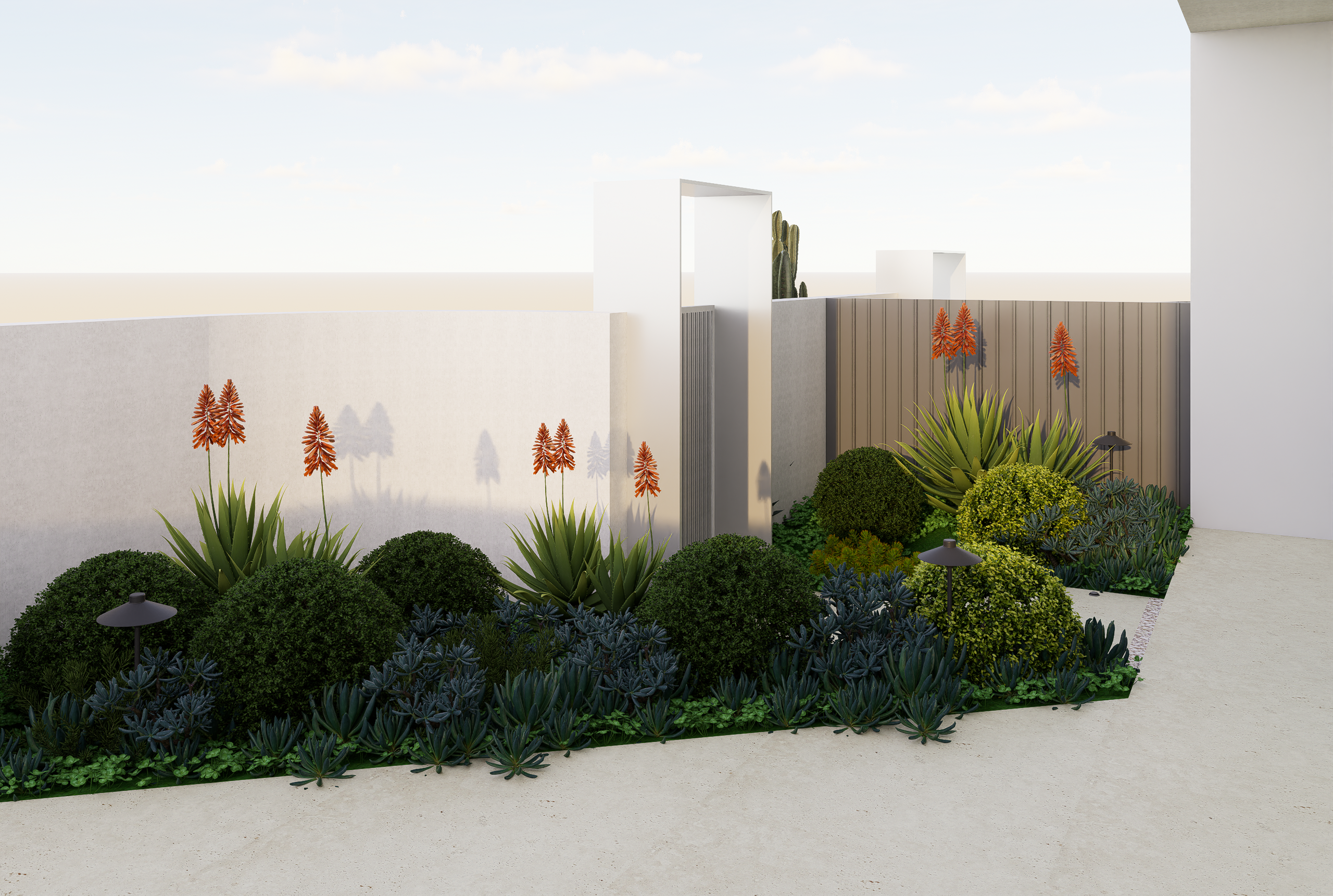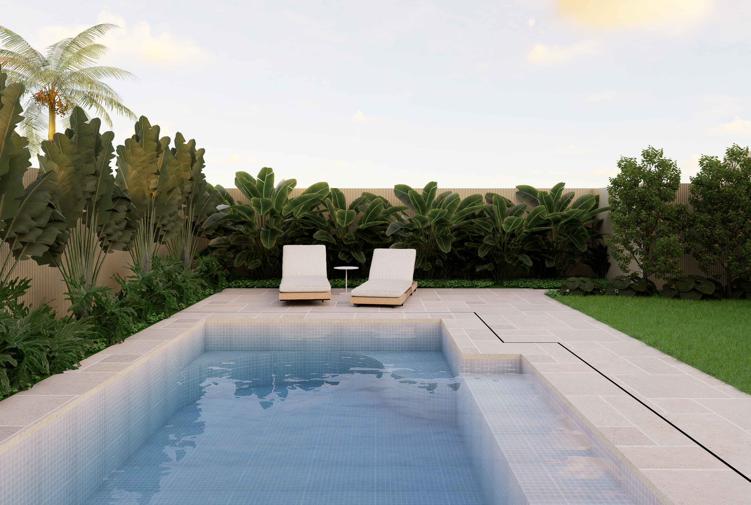 Set across a sloping site, this duplex garden blends modern tropical character with practical planning. The front public zone features a bold xeriscape palette of cacti and agave, framed by vertical metal fencing and off-white stone walls to define entry and privacy. Along the internal path, clipped shrubs and flowering groundcovers add depth and seasonal interest. The rear garden offers a relaxed retreat, with a swimming pool, lawn, sun lounges, and lush tropical planting. An alfresco dining area with swing seating and glass balustrades completes this low-maintenance garden designed for everyday living and entertaining.