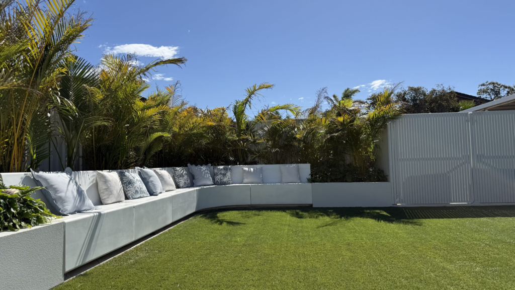 Designed for a long and narrow site, this modern garden focuses on clarity, comfort, and low maintenance. Vertical metal fencing and natural stone walls frame the front yard, where a beautiful tree anchors the space alongside structured lawn, clipped shrubs, and drought-tolerant planting. A softly layered side garden offers privacy and a calm transition. The backyard becomes the social heart, featuring a swimming pool, sun lounges, a fire pit seating area, and an alfresco zone with swing seating. Light-toned materials and resilient planting bring cohesion to a practical yet inviting family garden.
